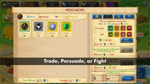 5、你所抉择的发展策略,会左右城邦的未来走向:是效仿雅典开展外交活动,还是偏向柯林斯专注商业发展,又或者如同斯巴达那般致力于军事力量的壮大?