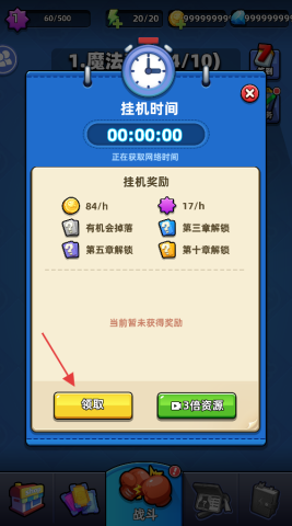 2、在挂机时间页面,点击【领取】按钮,就能获取挂机奖励(如每小时84金币、每小时17紫色资源等),还能选择观看广告,以三倍速度获取更多资源。