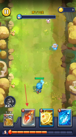 3、于关卡战斗里,底部设有技能卡牌(就像红色箭头所指的3级卡牌),需合理运用这些技能卡牌,操控蓝色角色,从而击败敌人完成通关。