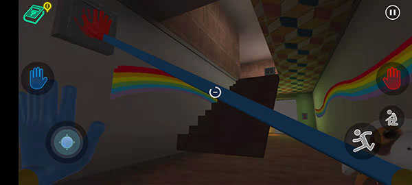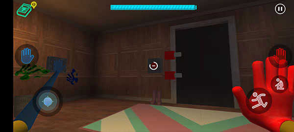 6、手套收集完毕后会自动出现在玩家手中,此时能看到墙的两侧分别有红色和蓝色的手印。玩家只需把手套对准相应区域,就能打开房门。