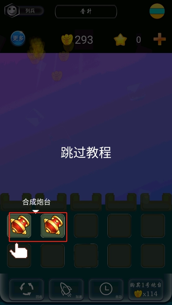 观察界面下方的两个红色炮台,按照指引完成合成操作,跳过教程以推进流程,解锁炮台合成玩法,为战斗布局打下基础。
