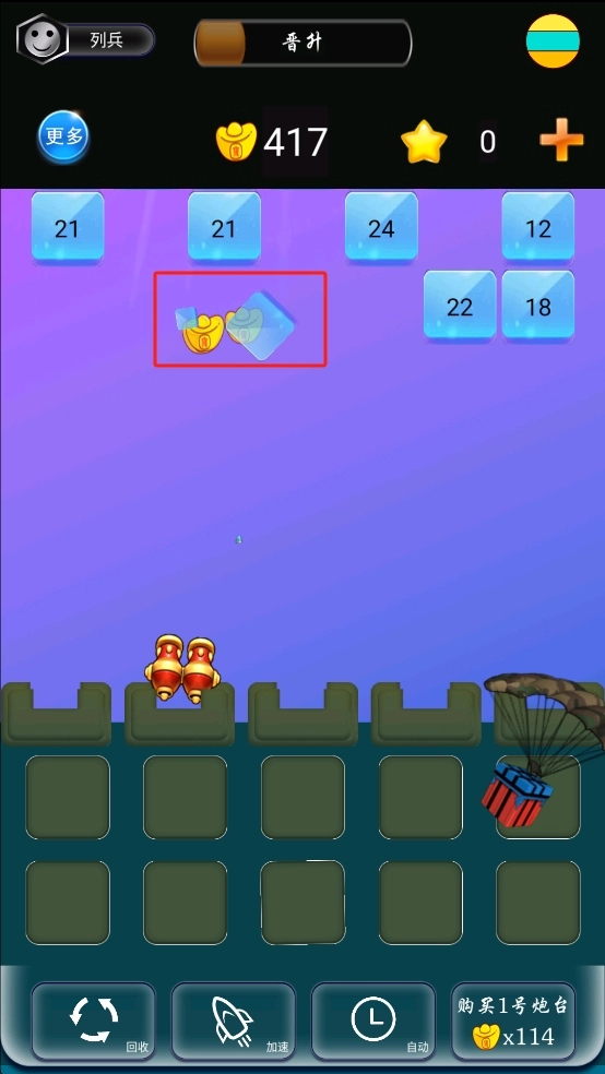 操控合成炮台去攻击上方的蓝色方块,把它击破后就能获取元宝资源,另外还要留意右侧的降落伞礼包,尽量争取更多收益来助力炮台发展。