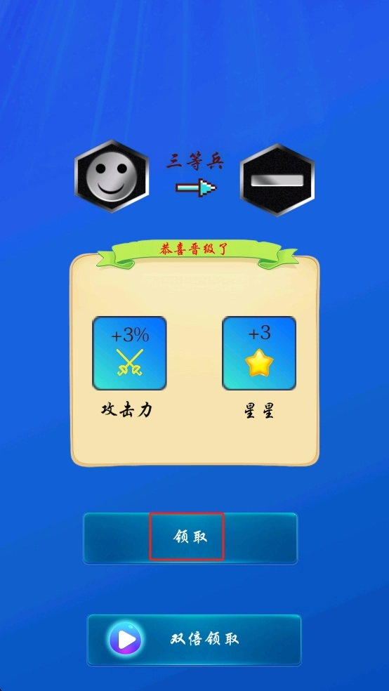当角色晋升至三等兵军衔后,点击界面中央的领取按钮,即可获得攻击力加成与星星奖励,从而提升角色属性,为后续战斗积累优势。