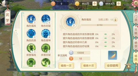 修炼系统能够增加角色、侠客以及宠物的百分比属性数值;修炼的最高上限和人物自身的等级存在关联。每进行一次修炼操作,都需要消耗银币、帮贡,还有秘参、鹿茸、灵芝这类道具。