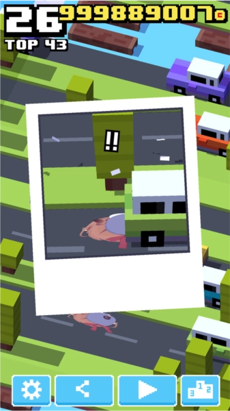游戏前期主要是左右移动的操作,到了后期,玩家就得处理车辆往来、跳跃河流甚至翻越障碍等情况,难度会明显加大。
