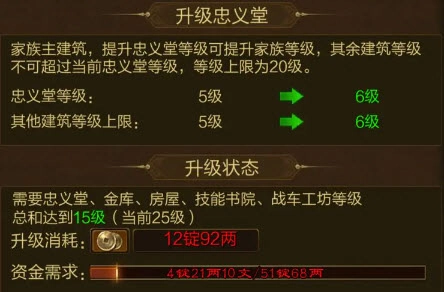 家族共有五座建筑,每座都支持升级,升级后能提升对应的属性。其中第一座是忠义堂,提升它的等级就能同步提升家族等级,并且其他建筑的等级都不能超过忠义堂,必须等忠义堂升级后,其他建筑才能跟着升级。升级需要消耗家族资金,而且消耗的数量很大,越往后升级所需的资金越多。忠义堂的等级上限为20级,这是系统设定的要求。