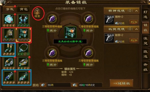 前期(60级之前)凑一套三等的魂魄石就行,开出来的三等优先镶嵌,多余的用绑银购买即可。这能增加不少战力,等后续打3v3比赛攒够三等魂魄石后,可以考虑换成四等套装;要是氪金大佬的话,直接一步到位也没问题。绑银招财会产出很多,前期绑银除了原地复活的开销外,大部分都花在魂魄石上了。
