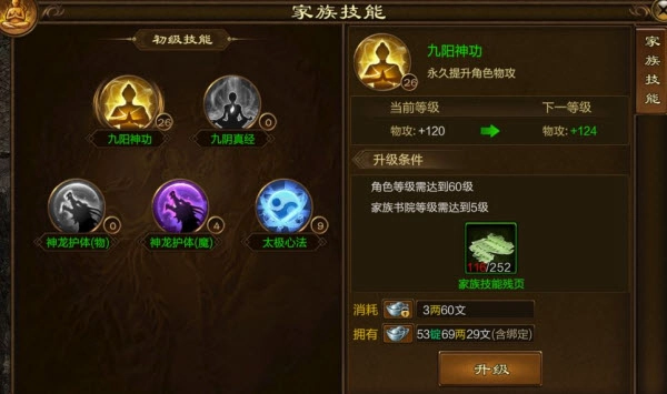 通过签到和家族商城兑换,能获取不少书页;优先提升对应的攻击与防御属性,可显著增加战力和实力。需要留意的是,53级和61级的技能书,建议前期用拉骆驼卖令牌赚的银子购买,此时技能书数量多且价格实惠,把贡献度省下来用于提升技能修炼,能带来可观的战力增长。此外,对于绑金充足的月卡玩家,前几周务必将家族技能要诀全部买完,即便第一周可能用不完,也要先囤着,后续会出现需求缺口。非月卡玩家则要尽量留存绑金用于购买家族技能要诀,而非花费在签到或购买药水等方面。