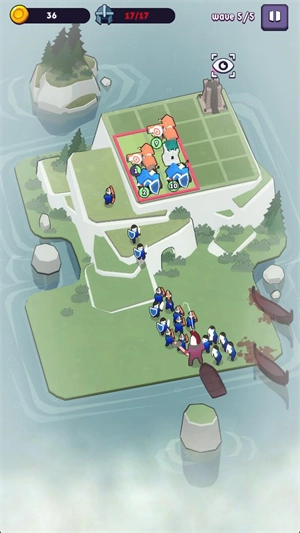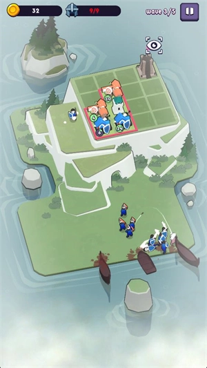 敌人将乘船从各个方向袭来,进攻你的小岛,小兵碰到敌人就会自动发起攻击。