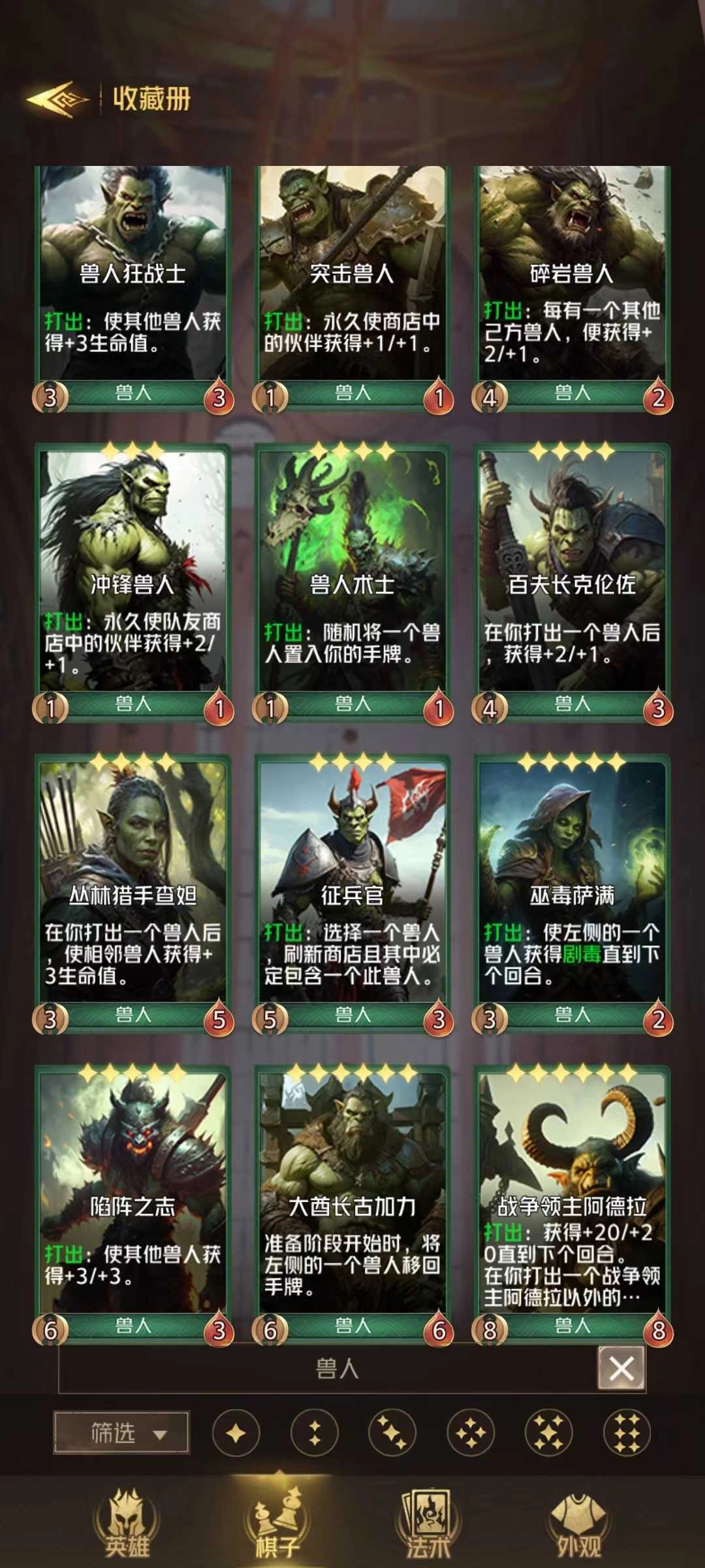 第三个势力为兽人,该势力在游戏前期的表现较为受限,核心原因在于前期难以提升血量,容易受到天使的护盾技能与亡灵势力的克制。不过进入中期后,随着丛林猎手与百夫长的加入,兽人能够快速积累属性值。由于兽人阵营拥有大量具备打出效果的卡牌,搭配中立卡牌黄金树人可以触发多重效果。征兵官的存在让玩家能轻松获取特定的兽人卡牌,兽人术士更是可以直接召唤多张飞兽人卡牌,配合大酋长的刷牌机制能实现持续不断的卡牌循环。近期更新的战争领主卡牌,尽管效果仅持续一回合,但其属性增长幅度相当惊人,后续版本可能会针对这一点进行一定程度的削弱。