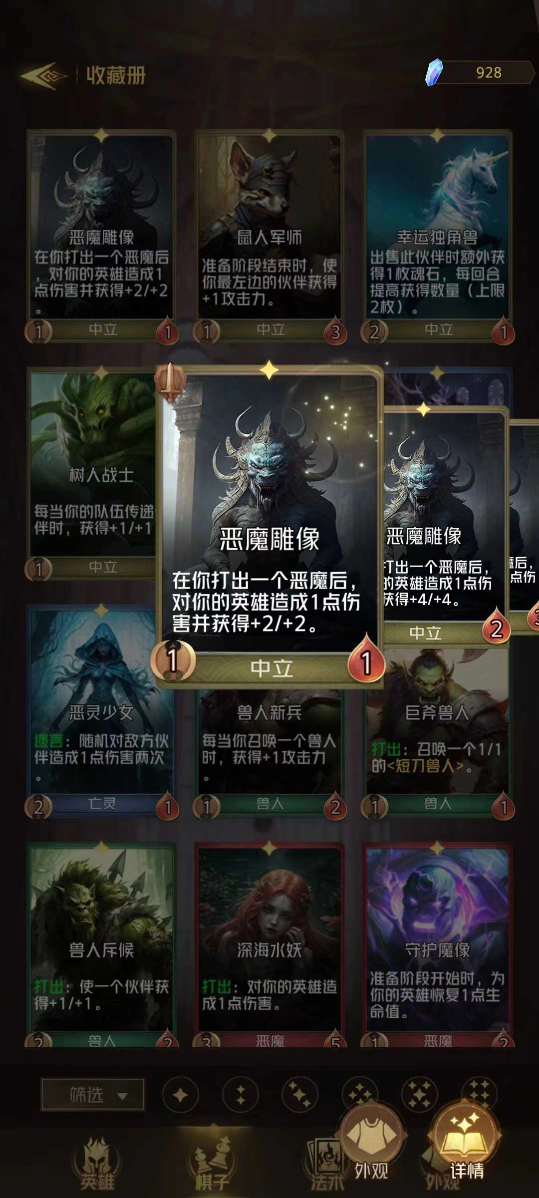恶魔体系的核心机制围绕“卖血”展开,其最关键的核心卡牌是恶魔雕像——每打出一张恶魔牌,英雄就会扣除1点生命值,但该卡牌的攻击力与生命值会随之提升。凭借这一特性,游戏前期能快速积累属性优势,为后续对局奠定基础。