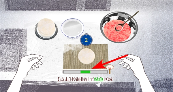 到了包饺子这一步,得通过点击来操控指针移动到绿色区域,这一步很关键,成功了才能继续推进这个互动流程。