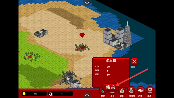 完成关卡后查看感染数据,接着点击【电源开关】就能回到世界主界面。