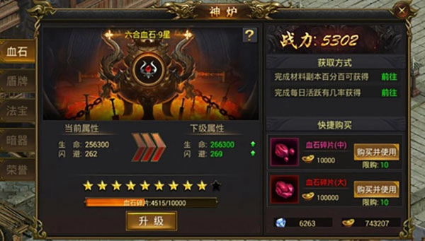 使用后能显著提高角色的生命上限与闪避能力,血石碎片可通过挑战材料副本、击败BOSS等方式获取。