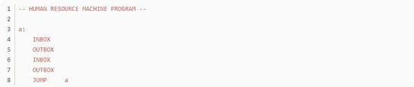 你需要让程序指示工人把INBOX里的每样物品都取出来,再放到OUTBOX中。