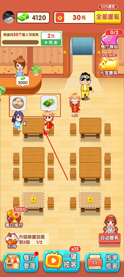 游戏进行到后期时,客人数量会比较多,这时候我们可以借助右下方的自动服务功能,让系统自动为客人提供上菜服务。