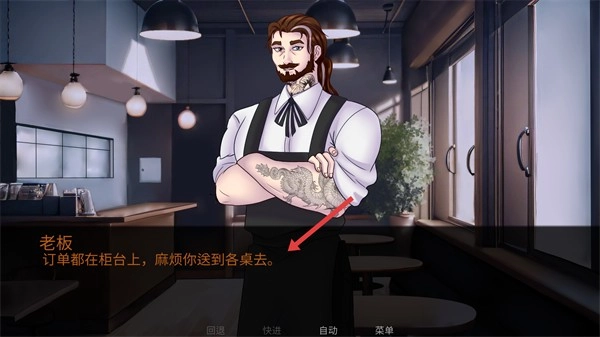 进入餐厅场景后,按照老板的指引,完成把柜台订单送到相应餐桌的任务,以推动游戏进程。