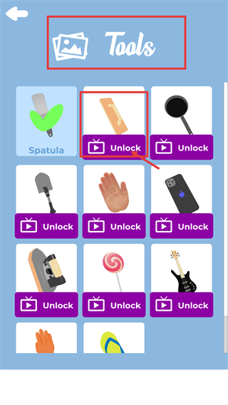 1、在【Tools】界面中,目前可以使用【Spatula】工具,点击对应工具的【Unlock】按钮就能解锁新的蛋糕装饰工具。