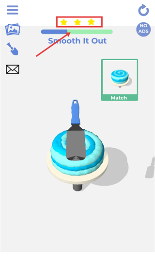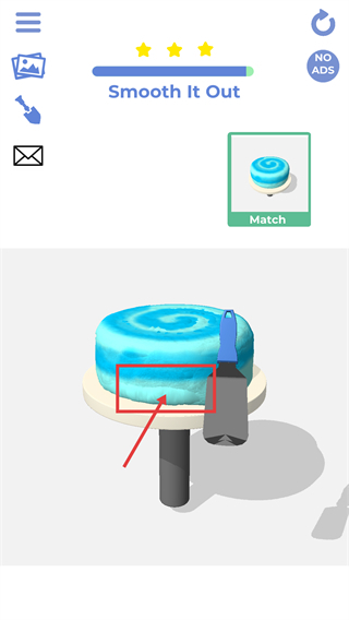 2、在【Smooth-It-Out】关卡里,借助工具打磨蛋糕的表层,朝着右侧【Match】所示的蛋糕样式进行调整,以此推动三星进度的达成。