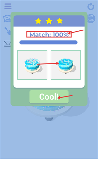 4、当匹配度达到【Match:-100%】后,点击【Cool!】按钮确认装饰效果,即可完成当前关卡的蛋糕装饰任务。