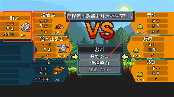 1、挑选【野人】【熔岩虫】这类Lv1魔物,点击【开始战斗】按钮开启对战,借助低等级魔物来积累战斗经验。