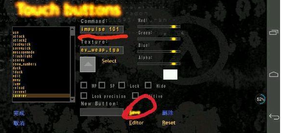 保存完成后进入游戏查看效果,刚才修改的正是屏幕正中央的那个,点击它,命令就会输出到操作台,xash3d正是借助这个功能来制作手机端版本的。