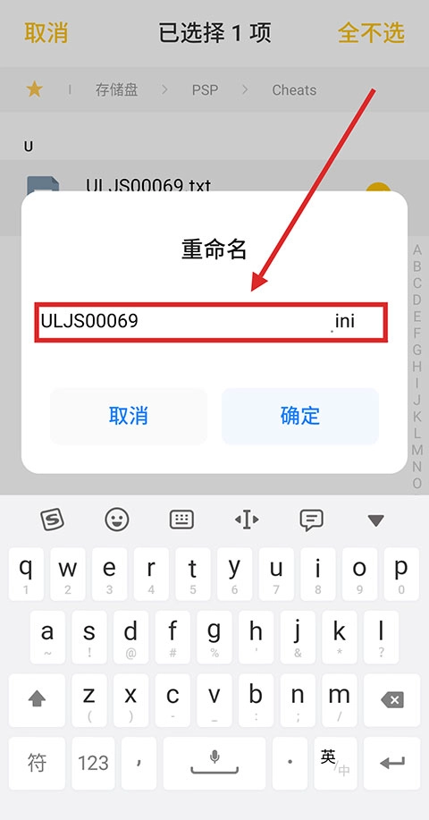 4、打开手机的文件管理功能,进入之前提到的那个文件夹,找到刚才保存的TXT文件,把它重命名为【ULJS00069.ini】——这一步非常关键,文件名里的每一个字符都必须准确无误,连ini这个后缀名也不能有差错,不然游戏可能没办法识别这个金手指文件。