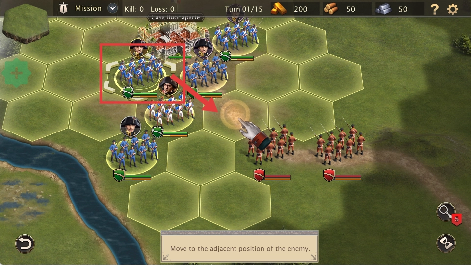 4、指挥部队,借助火力上的优势,留意敌我双方的血条状态,歼灭敌人。