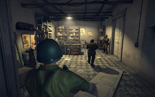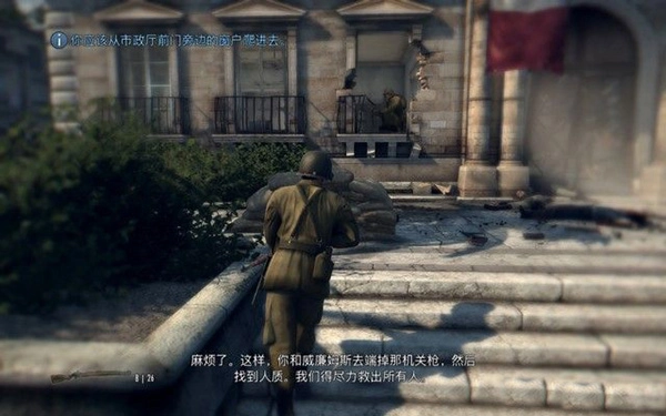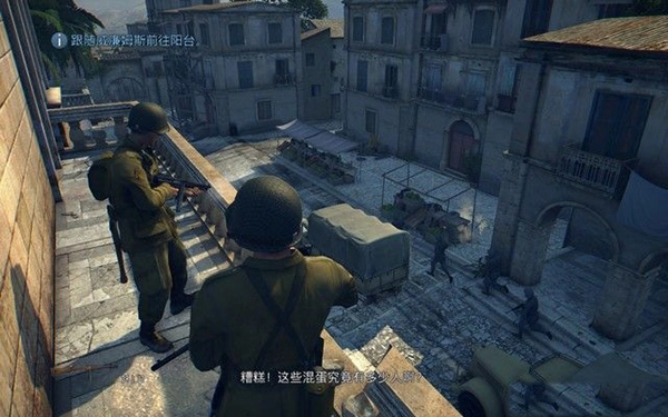 走到阳台,先与下方的敌军车队交火,随后一名敌人突然袭击,致使一名队友牺牲,消灭房间内的敌人后,大量敌军随即赶到。