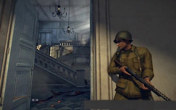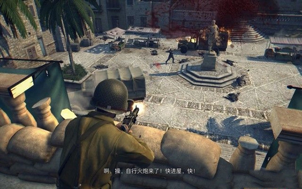 你可以走到房间的阳台,把MG42机枪架设好。这款重机枪的射速相当快,能高效地对敌人展开打击。不过要注意,敌人数量不少,你很容易陷入危险。这时候可以瞄准下方的卡车射击,把它引爆来炸死敌人。