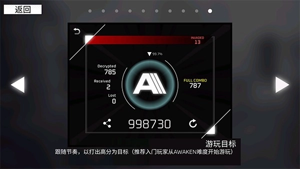 跟随节奏,把打出高分为目标(建议入门玩家从AWAKEN难度开始体验游戏)。