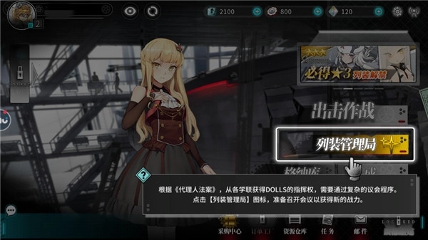 1、登录游戏完成新手引导后,在主界面找到并选择[列装管理局]。作为每位代理人获取新DOLLS的主要渠道,在这里消耗相应数量的物资,即可获得列装。
