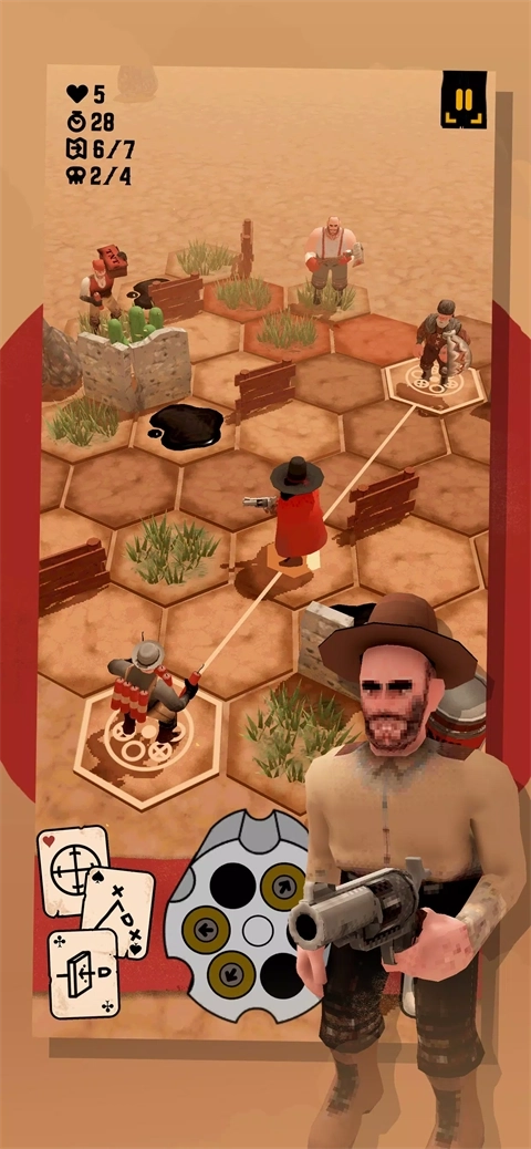 六向弹道彻底打破了传统射击逻辑,左轮手枪的六发子弹各自对应着六边形网格的六个方向,每次射击后弹仓会随机转动,这就要求玩家在开火前必须提前预判弹道的走向,这样的设计使得每一发子弹都变成了关乎生死的战术选择。