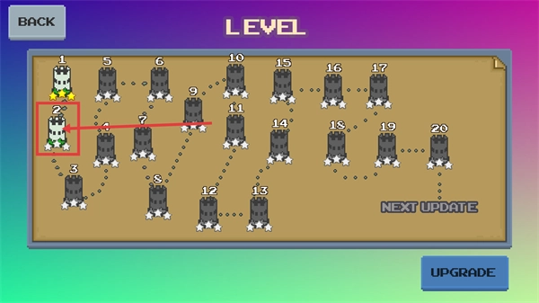 在关卡选择界面点击“Level2”即可进入第二关,该关卡采用星级评价机制,玩家可多次挑战以提高星级,完成本关后将解锁后续关卡。