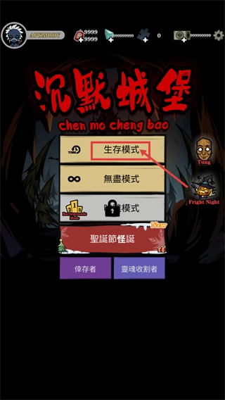 进入【沉默城堡】后,可选择【生存模式】-【无尽模式】等玩法,当前还有【圣诞节怪诞】活动,开局需选择【幸存者】或【灵魂收割者】。