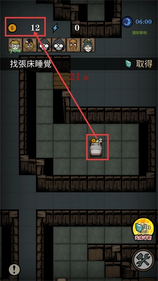 完成【找张床睡觉】的任务,靠近床时能获得【+2】金币,要注意界面上显示的【12】金币数值,另外也得留意【06:00】的计时信息。