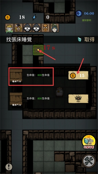 在界面里收集【15】枚金币,借助移动箭头去探索各个区域,要是碰到【橡木门II】,得留意它具备【800生命值】的防御特性。