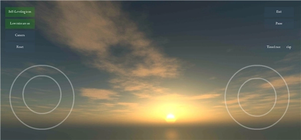 2、正式启动飞行练习,左侧依次排列着自调平开启、高帧率开启、第三人称视角以及最后的重置功能;右侧则设置有退出按钮与暂停按钮。