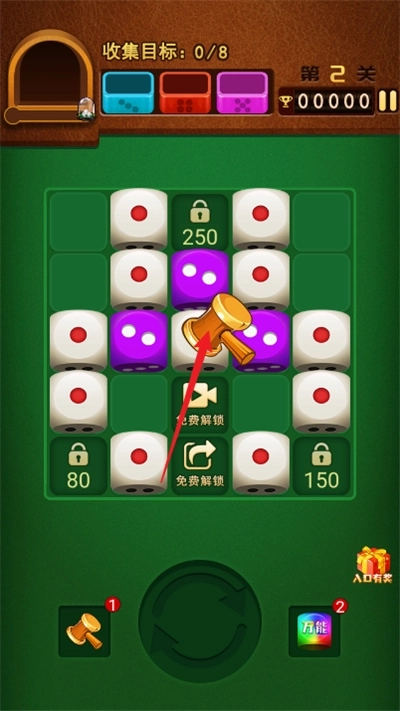 锤子:当你需要清理空间时,使用锤子能够砸掉周围的9个骰子,这个功能很适合这种场景。
