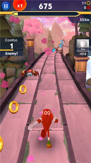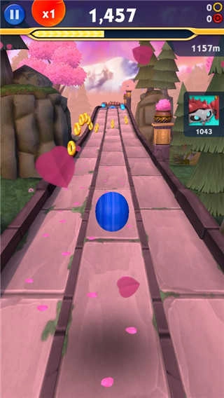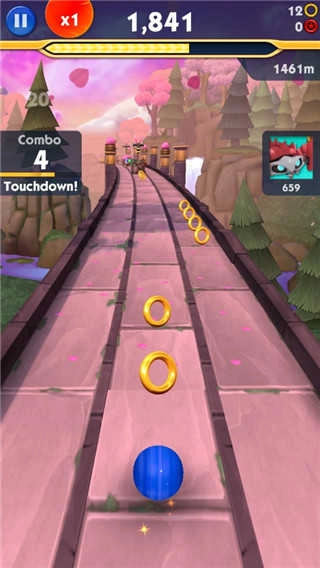 3、对比经典跑酷游戏《神庙逃亡》,《索尼克冲刺》具备更为绚烂的3D场景,并且采用了和《熊大快跑》相似的三条跑道设计!