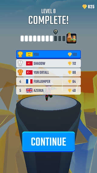 4、当我们抵达终点后会生成一个排行榜统计,位列榜首的玩家将获得较为丰厚的金币奖励,这些金币能够用于解锁各类皮肤