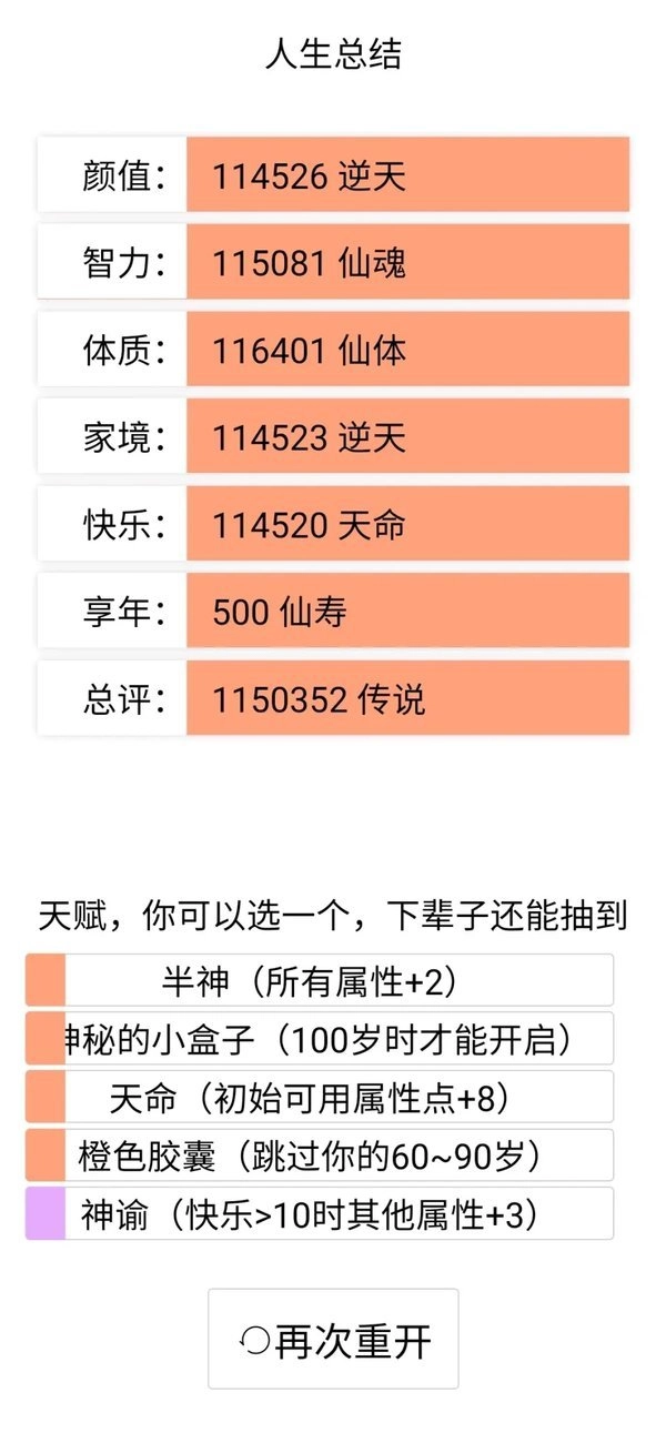 可调整初始属性,也可随机分配,最后点击开始新人生;