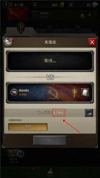 2、你可以在此处输入好友分享的入场码,点击“入场”即可加入;也能选择点击【开友谊战】按钮,自行创建房间。