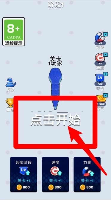 1.点击“开始”按钮就能开启全新一局的挑战,在游戏过程中可以对速度、力量等属性进行升级,通过持续成长来强化自身实力,进而逐步增强生存能力和对抗中的优势。