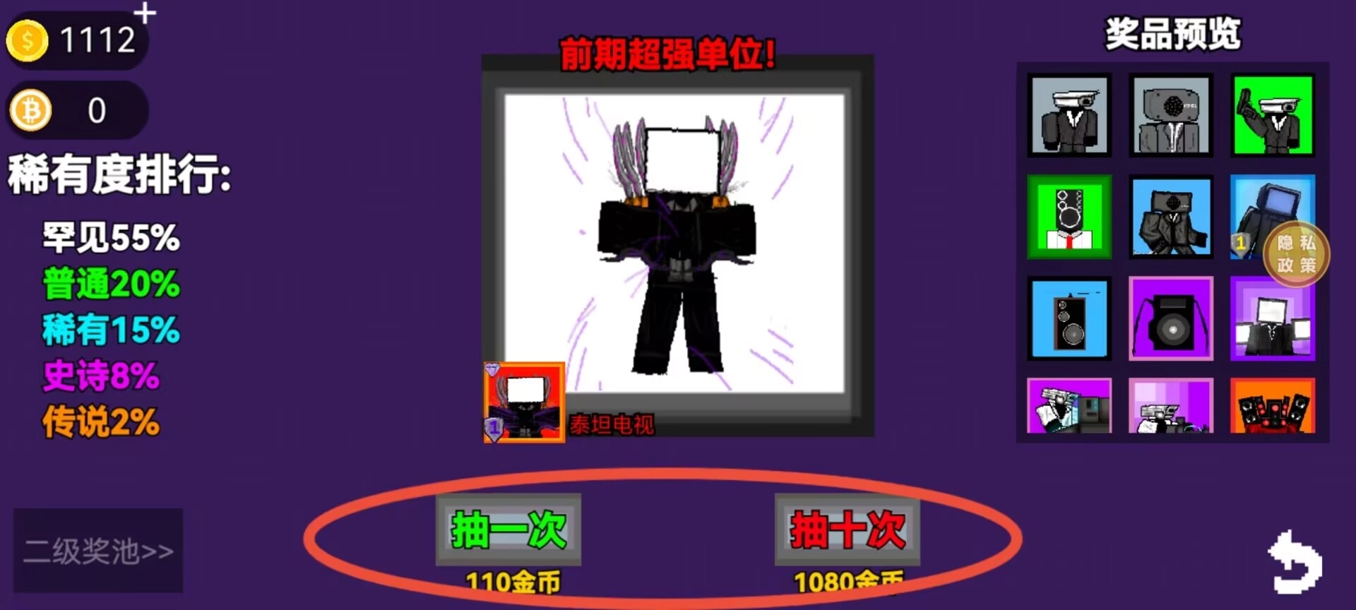 3、借助召唤系统,玩家能够用游戏货币抽取单位,单次召唤需消耗110金币,也可以花费1080金币进行十连抽,从而获取多个单位。
