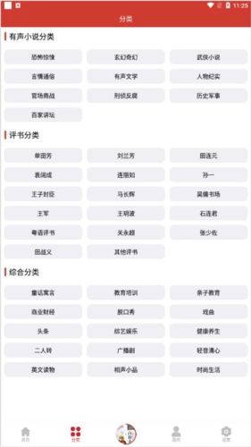 2、按分类查找:点击底部的“分类”,会弹出“评书分类”,依据个人喜好与需求挑选评书讲解员。
