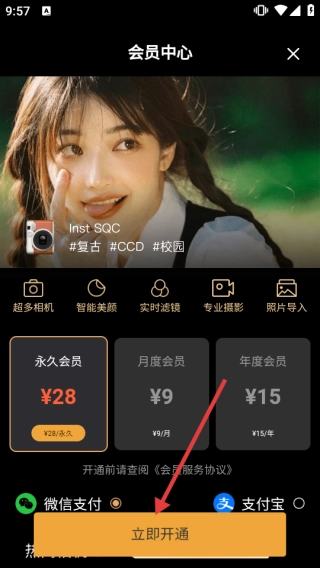 3、最终进入【会员中心】,选择永久会员、月度会员或者年度会员,点击【立即开通】,通过付费解锁后即可使用。