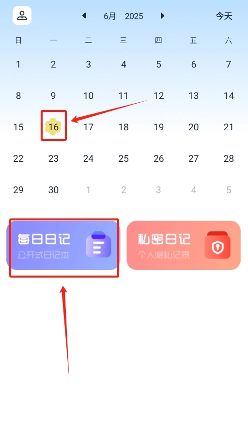 1、打开每日日记软件,在首页的日历上挑一天,直接点击 “每日日记” 准备记录。