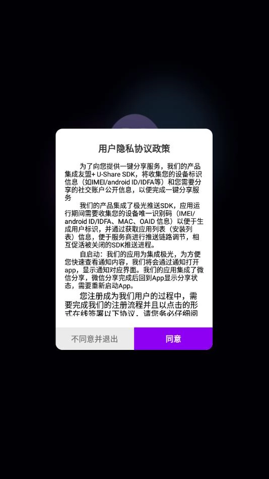 1、下载安装软件后后打开,点击同意用户隐私协议政策。