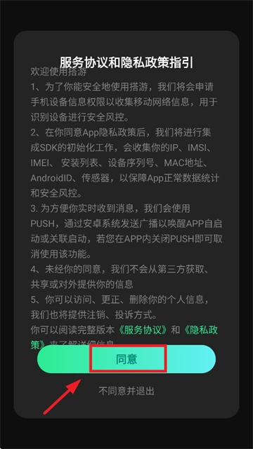 下载安装并打开搭游app,先同意服务协议和隐私政策指引